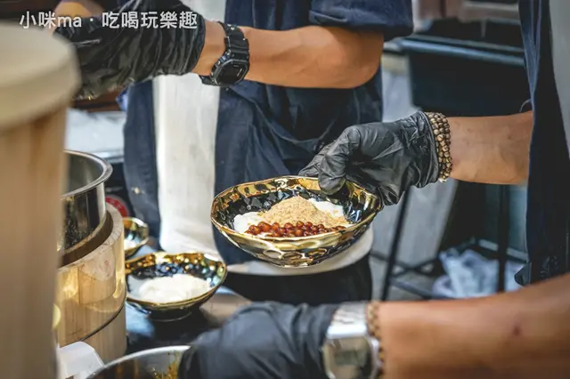 豆花裡加了糖水、花生粉、一種配料就完成,盛在黑金色的碗公裡變的好貴氣豪華啊