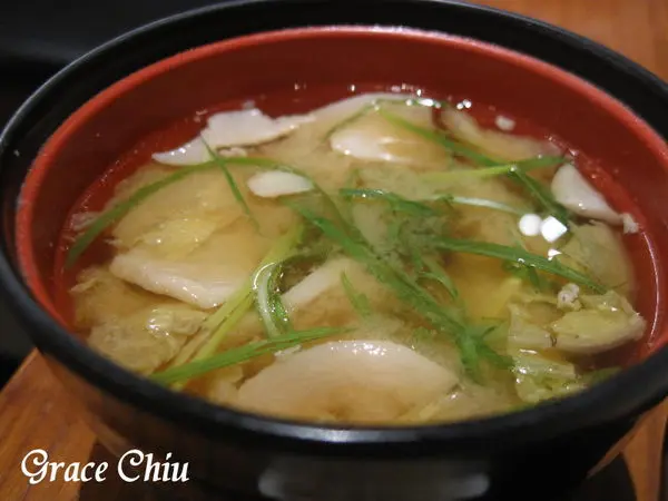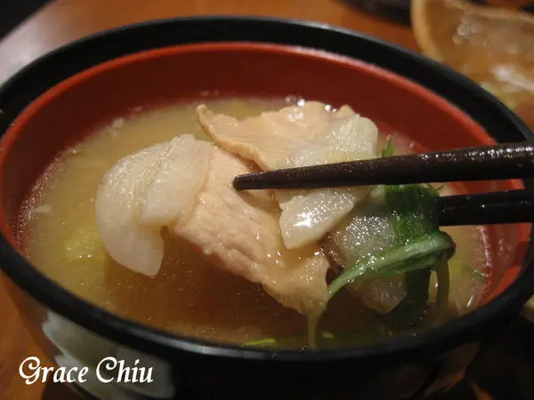 豬肉味噌湯,給料多多,其中有蔬菜.青蔥以及不少的豬肉片,湯在鹹味中帶著甜味.
