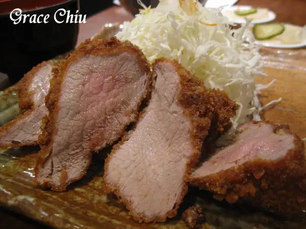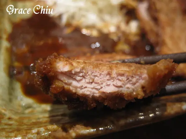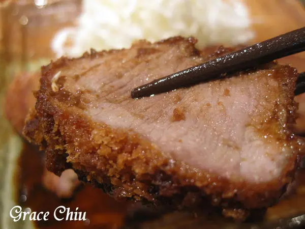 味噌腰內豬排~豬排中間還透著一些粉嫩,滲出來的肉汁光澤藏不住,光從肉色看起來就覺得這腰內豬排好可口丫!