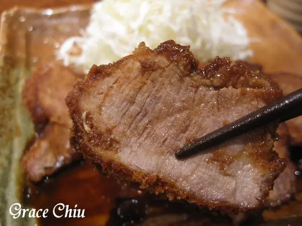 里肌豬排帶有少許油脂,咬起來在厚實中帶著軟嫩口感,搭著底下因為鐵板熱度有些微焦的高麗菜絲配越光米飯食用味道特別香.