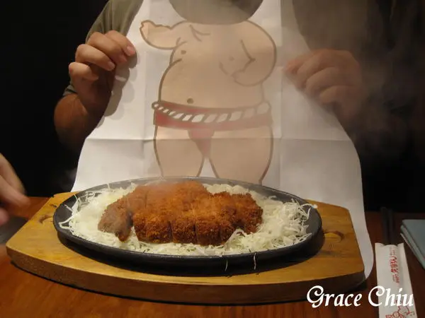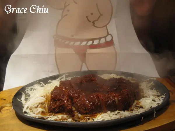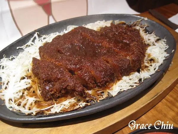 鐵板味噌里肌豬排~趁熱淋上味噌醬,醬汁觸及使得鐵板滋滋作響,眼前瞬間一陣煙霧瀰漫(Magic!喂~),味噌香氣在剎那間飄散開來,淋上味噌醬的里肌豬排看上去好像牛排哦~(鐵板熱度高敬請多留意)