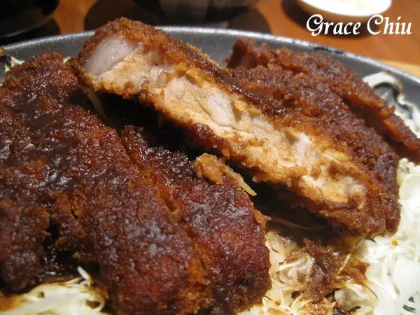 服務人員隨即為豬排淋上濃郁的味噌醬以完成餐點上桌的標準流程.
