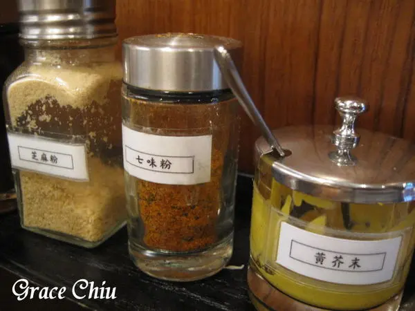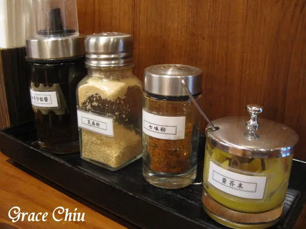 桌上亦有提供調味料,柚子沙拉醬.芝麻粉.七味粉.黃芥末,後三種適合搭配豬排,其中芝麻粉好像是市面比較少提供的,磨成粉末的白芝麻聞起來還蠻香,但食用時需要加比較多的量才能吃的出味道,三種調味裡個人覺得加七味粉的味道最為突出,店家的菜單上有提供美味的建議吃法,除了桌上提供的調味品外需額外附費加點的青蔥搭配好像也不錯,店家的建議吃法裡雖然有說可以先品嚐豬排原味,但這次體驗的二道餐點上桌後服務人員都會直接淋上味噌醬,沒有機會能嚐到原味,若能以提供味噌沾醬讓客戶自行沾取的方式那就更, 棒啦.