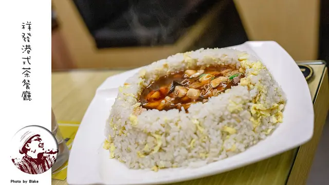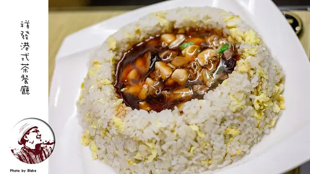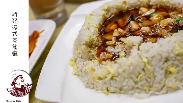 福建炒飯跟外面一般炒飯不太一樣,有一點像是炒飯燴飯,然後《祥發港式茶餐廳》這邊還特別用成一個造型,很像是蛋糕感覺,當出也曾被邰智源與小S等等藝人強力推薦,原本的炒飯是粒粒分明,然後把燴汁淋上去之後就變成炒飯,味道是比較鮮鹹還帶有一點甜味,雖然重了一些但不會太過,裡面的料超多的有,主要有雞肉跟一些海鮮料,整體的層次感很夠,強力大堆啊!