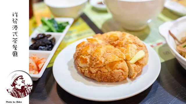 港式波蘿油也算是茶餐廳的經典,就酥脆的菠蘿麵包裡面包上鹹香的奶油,《祥發港式茶餐廳》的菠蘿算是比較台式一些,雖然還是很酥脆,但是總覺得有那邊不太對,但還不錯是有幫你切成兩塊,也方便你分食。