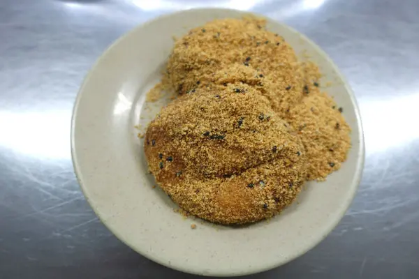 摻有黑芝麻粒的花生粉把麻糬包得密不透風,香氣撲鼻而來~