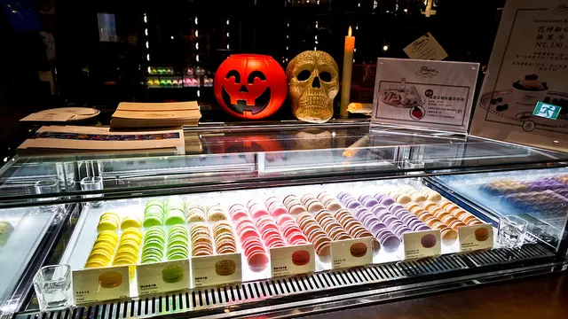 誘人的馬卡龍櫃上也擺好了骷髏頭和南瓜, 還有根蠟燭!!