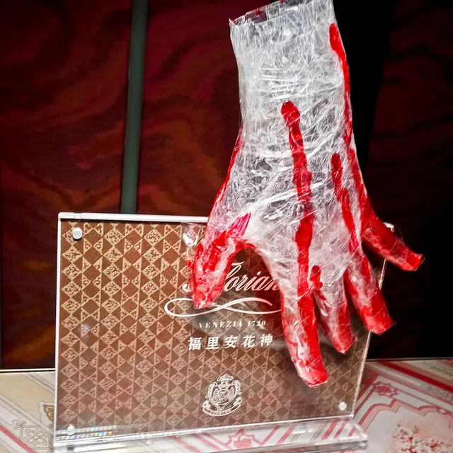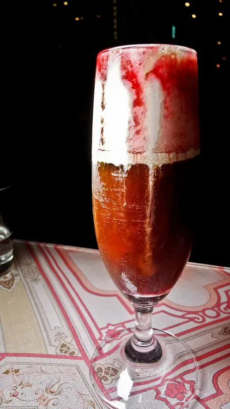 這是杯調酒。看起來像是血,很可怕吧?! 等到你來喝時會更可怕,因為裡面會飄浮著一顆果凍作成的人類眼球。光看就驚嚇度100分。但它是杯好喝的調酒,最上面白色部份是奶蓋,中間有些咖啡,最底下是金巴利加琴酒,甜中帶點苦,喝起來不錯。