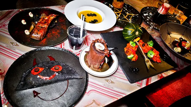 節慶的氣氛完全足夠,而且超用心的,那麼來看看這一年一度要萬聖節才吃的到的超特別餐點......好吧,單就畫面上來看,這真的不是整人嘛?要糖真的可 以,但這裡可是超有名的咖啡店,吃這邊的甜點會比較好吃喔。有個嘔吐的南瓜頭,像是手的羊排,煮著骷髏的巫婆鍋,還有可怕的大蜘蛛,湯裡還浮著蝙 蝠.......連飲料都像一整杯血,或是黑黑的墨色,這真的能吃嘛?! 該不會是從地獄來的料理吧?! 別懷疑,還真的能吃,而且很好吃!! 萬聖節料理的特色就是要夠可怕又夠好吃!!