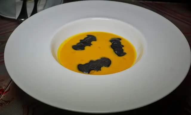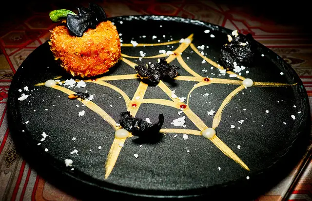 第一眼印象是,這是被蜘蛛網黏住的南瓜? 不過這是道很特別的前菜喔,炸的金黃色的是Crocchette ,其實就是可樂餅,可樂餅並不是日本食物,它也是從歐洲引進的,只是台灣多吃日式可樂餅就以為它是日本食物。 這道可樂餅作法特別,除了一定會有的馬鈴薯泥外,有著義式臘腸與洋蔥,要趁一上來就盡快吃掉,不然冷了就可惜了。盤子上的金色蜘蛛網是可食用金粉,蝙蝠與 旁邊的黑色脆片吃來很像是比較鮮的蝦餅,紅色一點一點的是覆盆子醬,白色圓點是蘋果泥。是的,這道菜每一部份都可以吃。