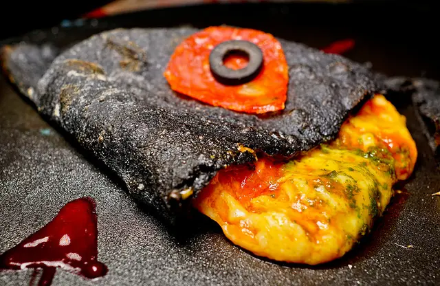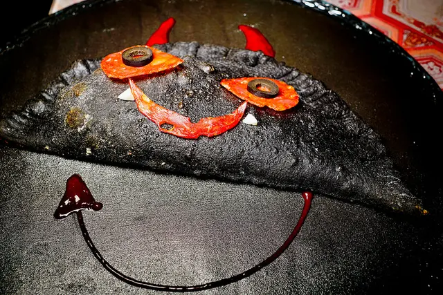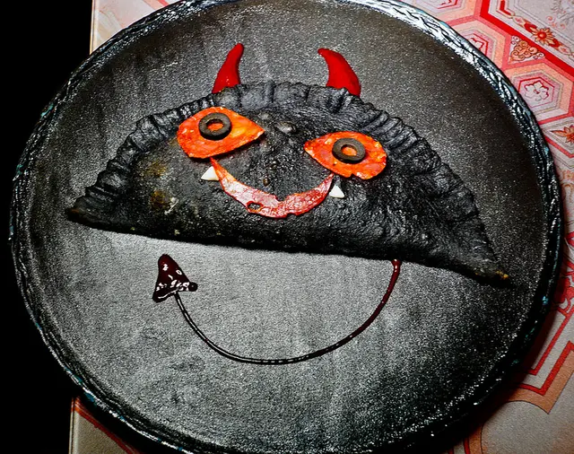 比起前一道菜,這道菜看來更可愛一點。有點像是電玩遊戲裡的可愛反派角色。calzone 義式披薩餃過去在台灣很少見,但這幾年因為義式披薩越來越多,也有不少人吃過了,它的特色就是用披薩餅皮包起來作成像餃子狀,在義大利可是很紅的快餐。這個黑色的外皮當然是......墨魚汁。然後眼睛與嘴是義式臘腸,眼珠是黑橄欖,白色露出的牙齒是蛋白,還用蕃茄醬畫了個惡魔尾巴。吃這道菜一樣要動作快,雖然它很可愛,但拍太久會後悔!!