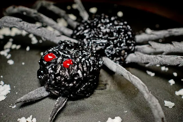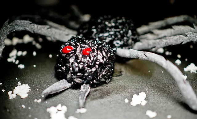 對,這些看來不管是可愛或可怕的餐點,都是可以吃的。這蜘蛛腳還蠻脆的像是好吃的餅乾,小朋友可能會很喜歡。之後也可以拿來配湯吃,另有一番風味。燉飯相 當鮮美,米飯稍軟一些,女生來吃完後記得要稍稍處理一下牙齒,不然一張嘴都是黑牙,人家還以為你是什麼古代日本貴族穿越來著 ( 古代日本貴族女性會把牙齒染黑 )。