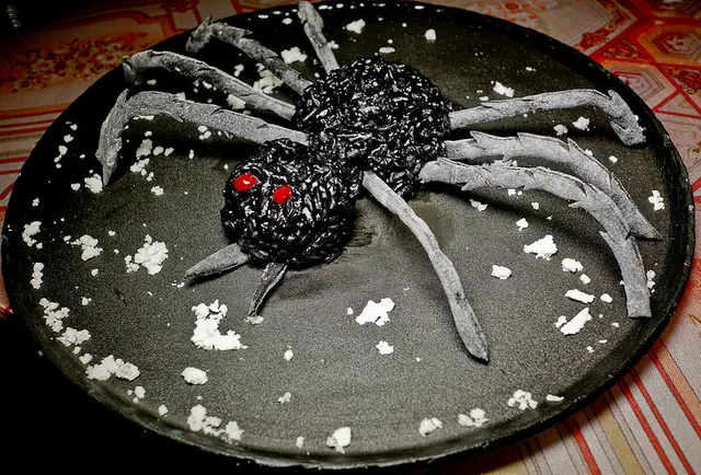 這還真的黑寡婦,蜘蛛啊......對於吃貨來說,聽說蜘蛛烤過像黑巧克力.......。這不是啦,它是做的很像真蜘蛛的墨魚燉飯!! 如果有那麼大的蜘蛛也太可怕。這裡的燉飯十分講究,用的是義大利米,以炒過的洋蔥為底,然後加上鮮美的墨魚汁與墨魚高湯燉煮。十分鮮美。鮮紅色的眼睛是番 茄醬,牠的八隻腳與嘴,是特別烤過的墨魚麵糰。脆脆的很好吃。