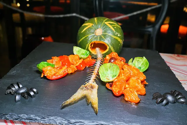 單看外表你會覺得這什麼鬼,魚骨頭?! 不過多看幾眼,就懂什麼是南瓜YA到吐!! 這是顆很貪吃的南瓜,想一口氣吃掉一隻魚,結果貪心不足反而噎到吐出來,超有創意的一道菜。這道菜在義大利原來是要用鱈魚,台灣限於材料關係很難有好的新 鮮鱈魚,就改用了台灣在地好吃的午仔魚來做。搭配洋蔥、番茄、蒜片、橄欖等調料,沒有魚刺,相當好吃,魚肉有點點類似糖醋魚,酸甜中帶些酥脆。會讓你一口 接一口的美味。