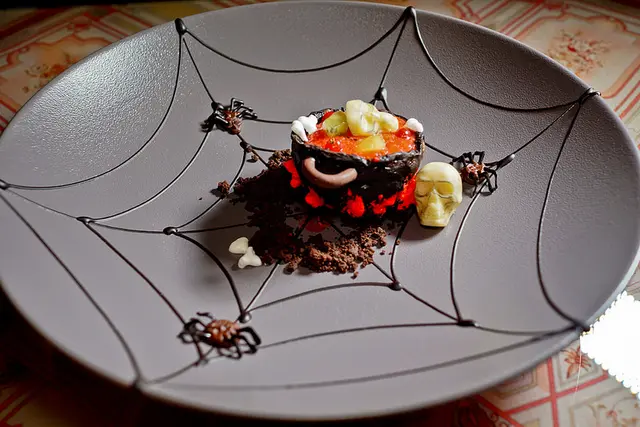 轉過來後靠北,煮骷髏頭?! 這有可怕,而且超有創意,底下做成像是泥土,然後紅色的像是火燄,黑色的鍋子還有把手,裡面煮的是骷髏頭和紅色不知什麼的湯。光看就覺得是藝術品啊。其實 底下的土是巧克力,鍋子是泡芙再塗上巧克力,紅色的湯頭是秘製莓果醬,骷髏頭是白巧克力,蛛網與蜘蛛都是巧克力作成。