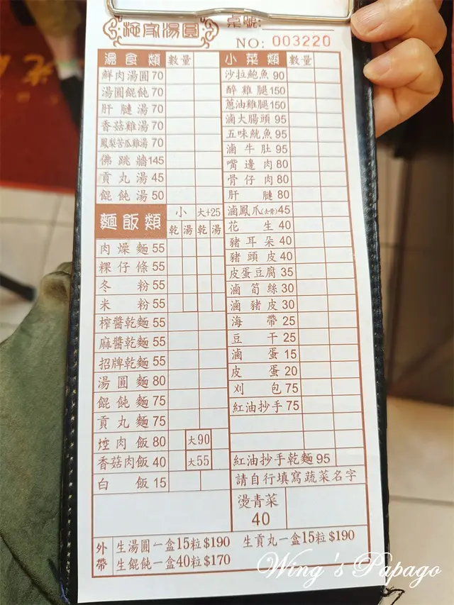點餐單,以招牌湯圓及各式麵類為主,也有焢肉飯、香菇肉飯、餛飩麵、小菜等,