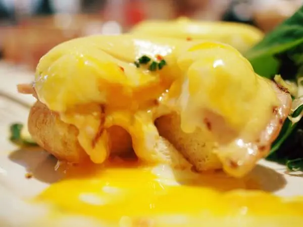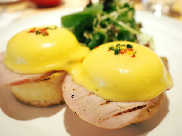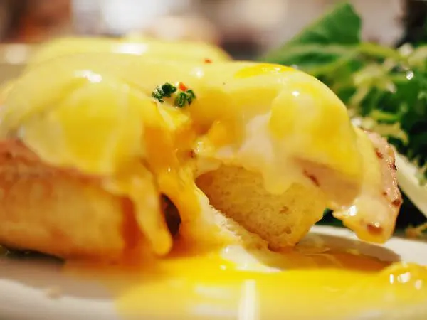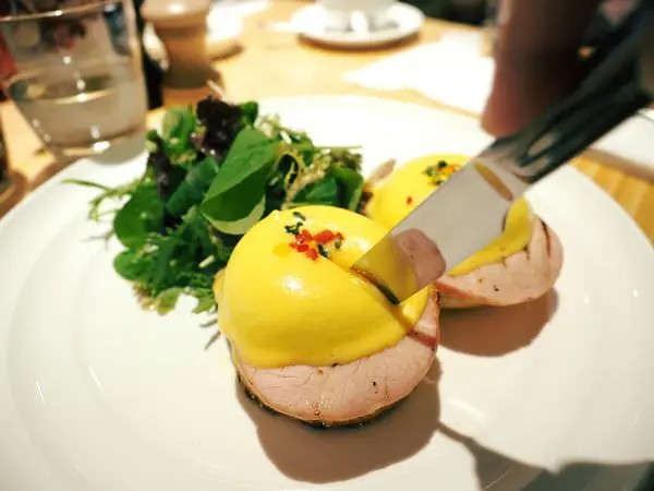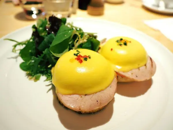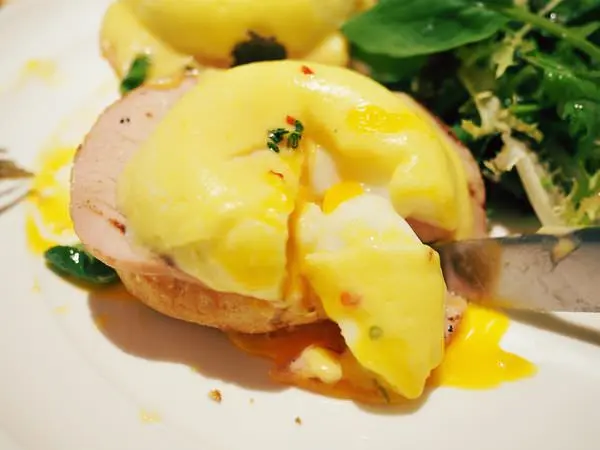 溫熱的蛋液往下流瀉,浸潤下層的英式馬芬,搭配特製荷蘭醬、火腿入口,豐富而滑潤。