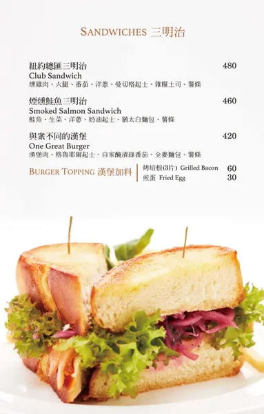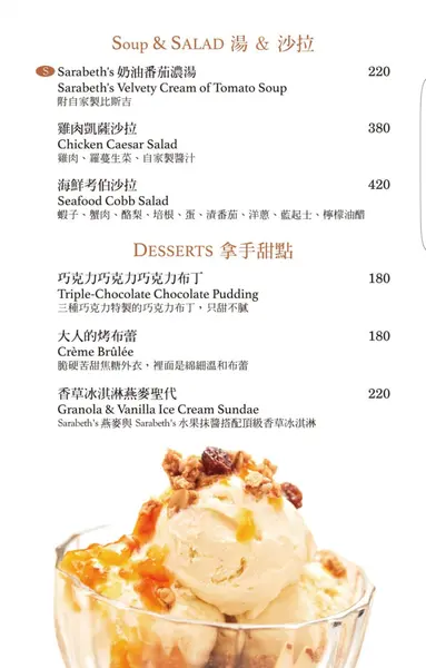 最後兩頁菜單:Sandwiches 三明治、Soup & Salad 湯 & 沙拉、Desserts 拿手甜點