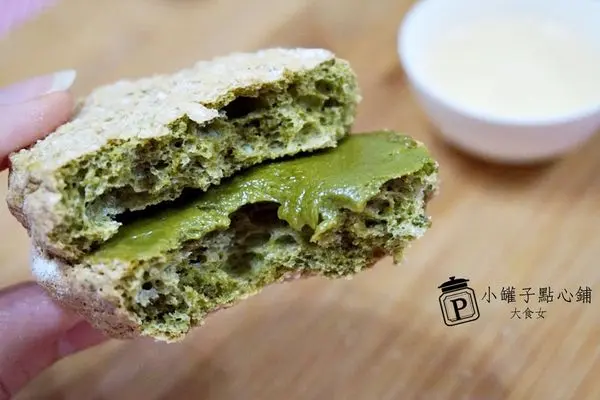 ▼抹茶脆餅乍看之下,還真彷若惡煞手持的狼牙棒(驚),但一入口中,抹茶的清新完美地抹滅了這暴厲之氣,甜度偏低的蛋白霜帶股抹茶清香,裏頭稍稍滲出的抹茶餡,吃起來跟大食女先前DIY抹茶生巧克力的滋味極類似!像極了當時將白巧克力、奶油溶化後,將它們與抹茶粉拌作夥的味道,甜度上明顯較蛋白霜高了不少,但卻不是過於甜膩那種,而上頭的杏仁顆粒更有意無意地刺激著味蕾,真可說是口感層次相當豐富的一款甜點!大食女一家人當天看著電視,不知不覺便將他完食了