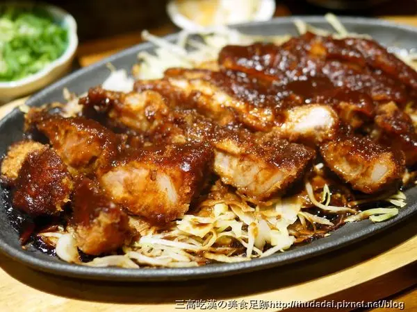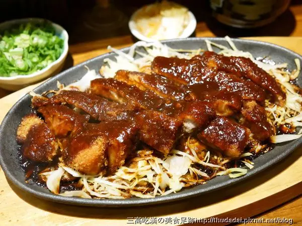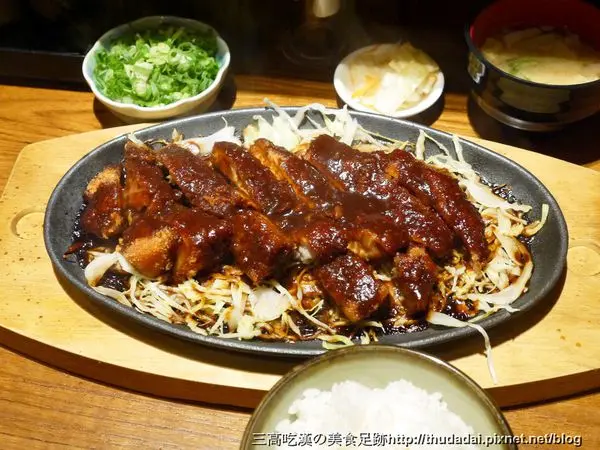上桌時以鐵板鋪著高麗菜絲,擺上豬排,服務生淋味噌醬時會滋滋作響的噴灑,