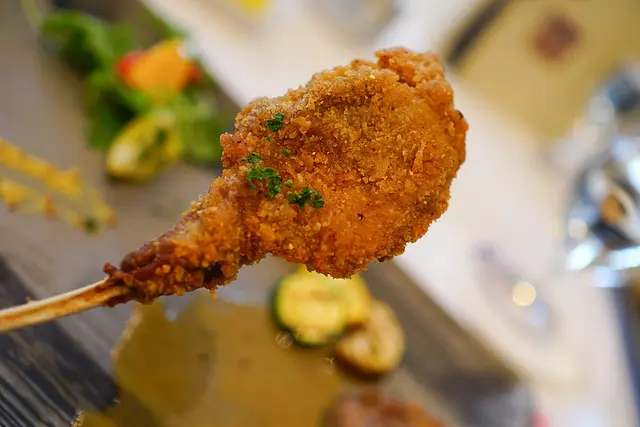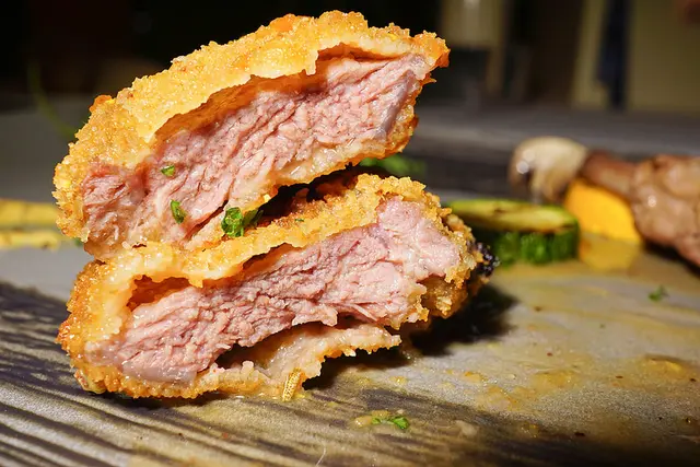 推測就與米蘭豬排類似, 在炸衣裡有加起司, 且是用加了香料的奶油來炸的