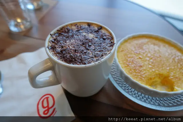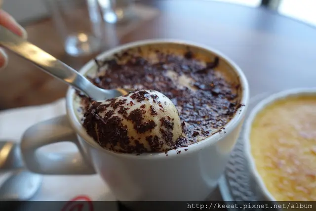 可能是因為餐廳才開始試營運,所以等了一段時間,美姬點的比利時那提才上桌,那提不是很大杯,上面灑滿了黑色的GODIVA巧克力,店員有說上面的GODIVA是冰的,可以用湯匙直接吃,或是跟著奶泡一起吃,也可以攪進咖啡用喝的。美姬真的要說咖啡跟巧克力真的是絕配,尤其是跟GODIVA的巧克力,很純很濃的巧克力味,配上不是很濃郁咖啡味的那提,喝一口就讓人洋溢著一種幸福感~不過美姬選的比利時那提跟美姬選的烤布蕾並不是很搭,因為比利時那提是屬於不苦的咖啡,所以大家在點咖啡選蛋糕的時候,可以問一下店員的意見。