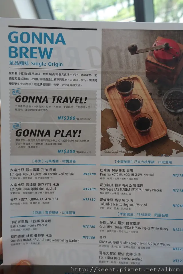 背面就是單品的部分,對於喜歡嚐鮮的人,可以選擇一次喝三種咖啡或是一次喝三種泡咖啡的方式。