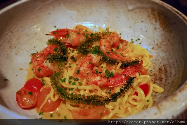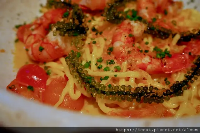 今天的主廚義大利麵是胭脂蝦義大利麵$880,吃起來蝦味非常的濃郁,麵條吃起來也特別,吸了滿滿蝦味的義大利麵吃起來Q彈有口感,除了吃起來很新鮮美味的的胭脂蝦外,還點綴著很可愛的海葡萄。