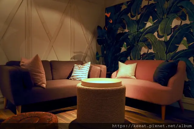 旁邊的角落還有兩桌沙發,跟一整面綠色葉子的牆面。
