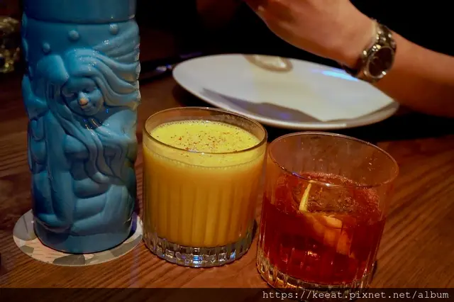 最左邊的小拔點的特調,小拔很厲害每次都點到很異國風味的調酒,右邊是這次新加入成員民哥喝的波本威士忌,中間是美姬喝的無酒精芒果優格特調($220)。