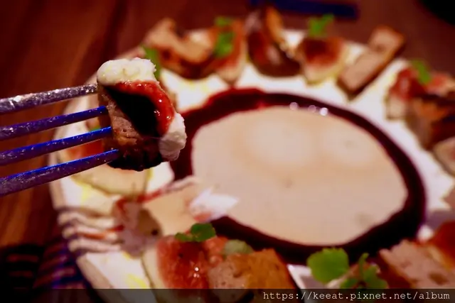其實無花果跟吐司下面是厚厚的一層瑞可塔起司,這道菜有很多種吃法,吐司跟無花果一起吃,或是分開吃,也可以沾起司或是只沾醬汁,也可以兩種一起沾。