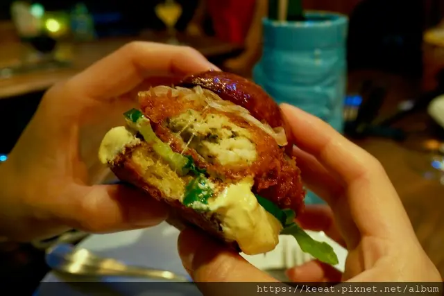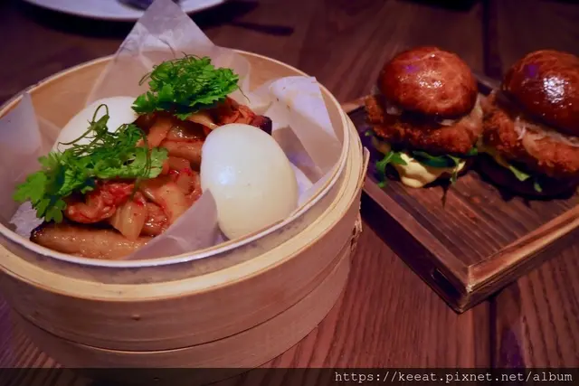 再來上的是兩份前菜,叉燒包($420)跟鮮蝦漢堡($420),其實就是一份中式漢堡跟一份東南亞漢堡。