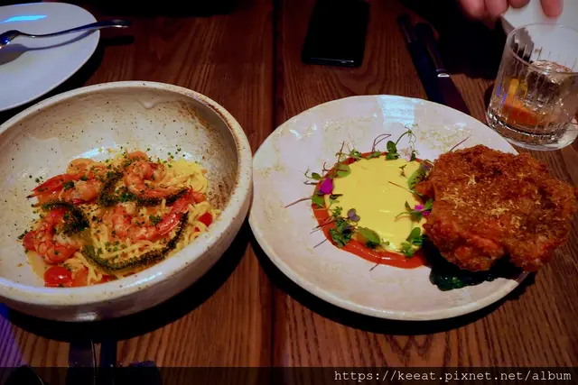 再來是一份前菜跟一份主菜,左邊的是前菜 主廚特製手工義大利麵(時價),右邊是服務生推薦的主菜香脆炸雞($480)。