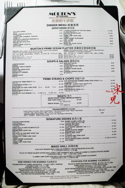 整個台灣一窩蜂開設牛排館,如果沒有兩把刷子,自然是很難在市場上穩穩站住腳步的。這「莫爾頓牛排館」來頭不小,因為它已經風靡全球數十載,全世界擁有七十多家分店,每家都以超大分量的頂級牛排著稱,而全球第74家台北店,更可說是全台灣最高的景觀牛排館,而這裡菜色最大的特點,就是全部採單點方式上菜,每一道菜都分量十足,菜單上可見到的「珍寶」二字,可不是形容菜色有多珍貴,而是直譯英文JAMBO而來!所以這裡的牛排最少都16盎司起跳,很適合二個人分食,如果食量不大,二個人點個牛排再加上二道菜菜、一道甜點,加上餐前的超大自製洋蔥麵包,吃下來其實相當有飽足感!