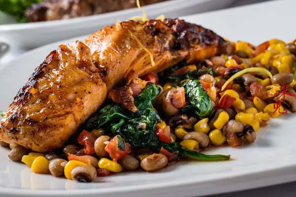 倒是這個鮭魚主菜非常可口,鮭魚烤得恰到好處不會柴柴的,搭配的配菜玉米和豆子也相當順口,連我這不愛鮭魚的人都很喜歡。