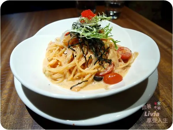 ❖ 明太子魷魚義大利麵麵條軟硬適中,濃郁的明太子醬的口感,搭配上小番茄,