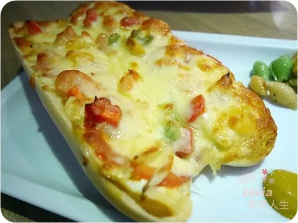 飲料則是榛果咖啡(熱)以及紅茶(冰),鮮蝦番茄披薩餅皮是用麵包去做的,