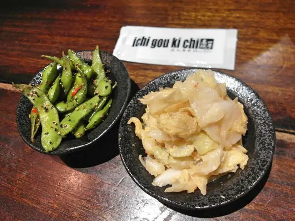 首先上桌的是每桌都會招待的小菜毛豆以及 基地泡菜($70)