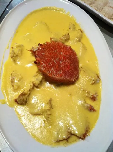 上面一盤黃油油的螃蟹,其實是來自日本北海道的毛蟹,全身長滿了紅通通的細毛,肉質鮮嫩有牛奶的味道!切成塊狀後淋上熬了一個晚上的老母雞高湯和花雕酒提味,利用蔥薑去腥,放進蒸籠蒸熟!
