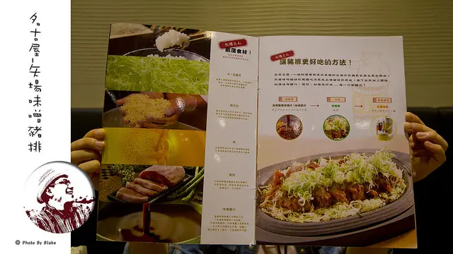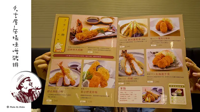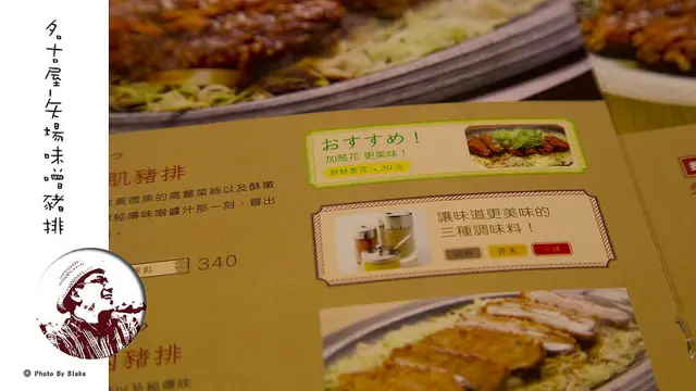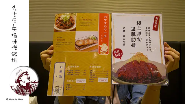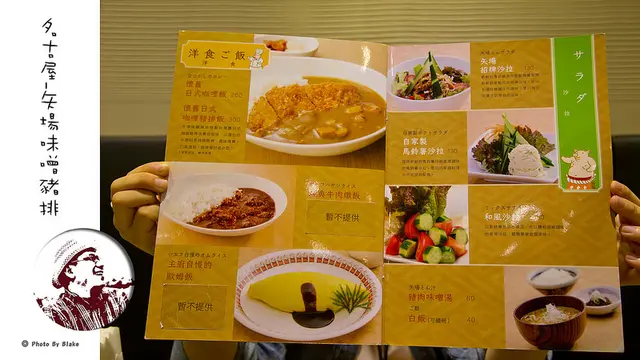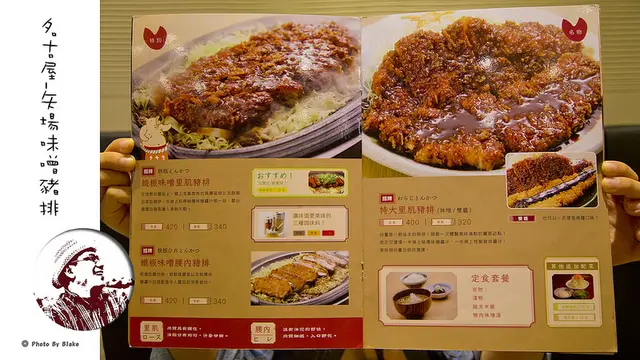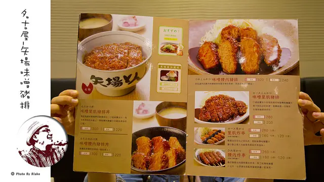名古屋矢場味噌豬排想當然爾賣的大多是炸豬排,菜單如下面的圖面所示,有一般的炸豬排,然後加大或用鐵板的豬排,不同位置的腰內肉或里肌肉豬排,從丼飯、鐵板、定食到炸串,都是以豬肉為主,價格從260元到420之間,一般都會再附碗白飯、湯與高麗菜絲。