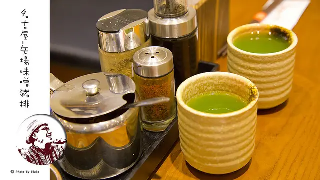 一到座位就給兩杯冰涼的抹茶,但這抹茶真的有一點稀,就止渴而已,可別當真的抹茶看待,桌上會和風醬油、芝麻粉與辣椒粉三種調味料,可以用來調味高麗菜絲,還有醃菜可以加減配飯。