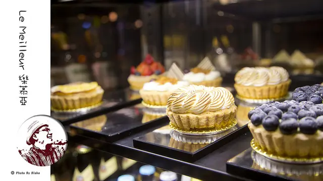 甜點一上桌,用了水果、馬卡龍與奶油點綴,看來比起一開始在櫥窗看到的還要可愛,藍莓派鋪滿了整個外層,內餡是濃郁的卡士達醬,入口就是酸酸甜甜的,但吃多了有點膩口。