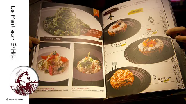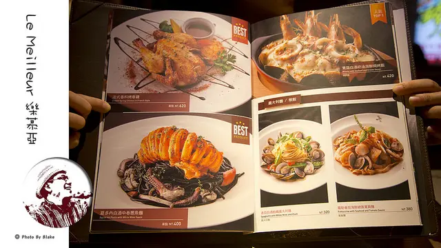 Le Meilleur 樂慕亞菜色以排餐為主,牛排是主力,豬腳、魚排、羊排與海鮮也都是主餐的選擇,另外還有些義大利料理,如義大利麵與燉飯,餐點價格從300多元到1200元都有,就看每個人的選擇。如果單點主餐覺得單調,還能選擇加NT$250元升級超值餐,有開胃菜/麵包/沙拉/湯/甜點/飲料,或者加NT$180元升級輕鬆餐就有麵包/沙拉/湯/飲料。
