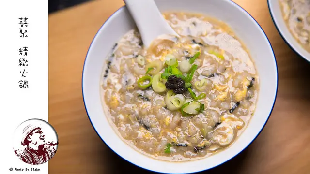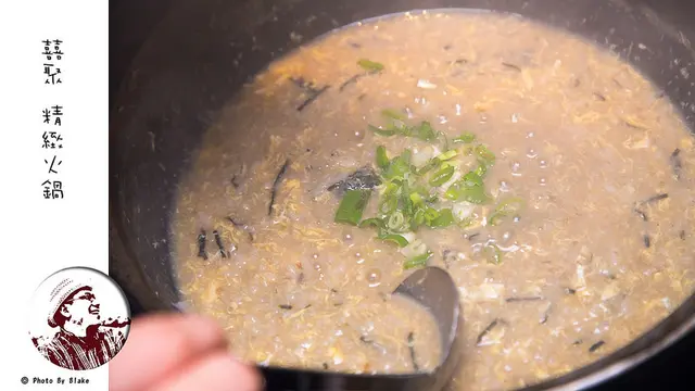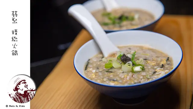 在囍聚點海鮮鍋,最後還有一個小驚喜「雜炊」,將煮海鮮的精華湯頭來煮粥品,這是免費提供的,但只限海鮮鍋可以點,因為囍聚精緻火鍋認為單純肉鍋煮到後來味道上太濃,湯頭太油沒有海鮮那麼鮮甜,如果你點肉鍋堅持一定要吃上這碗粥品,那就必須加收350元的費用。原則上湯頭都要先處理過,先把原本的食材撈起來再去濾過,讓火鍋最後的湯底只有清湯,避免讓其他味道或食材讓整個雜炊走味。
