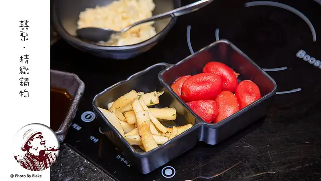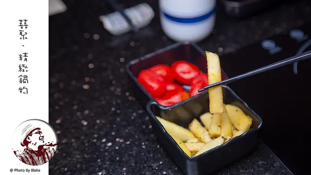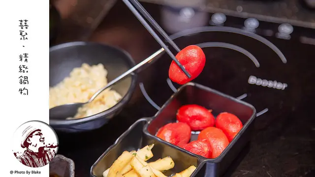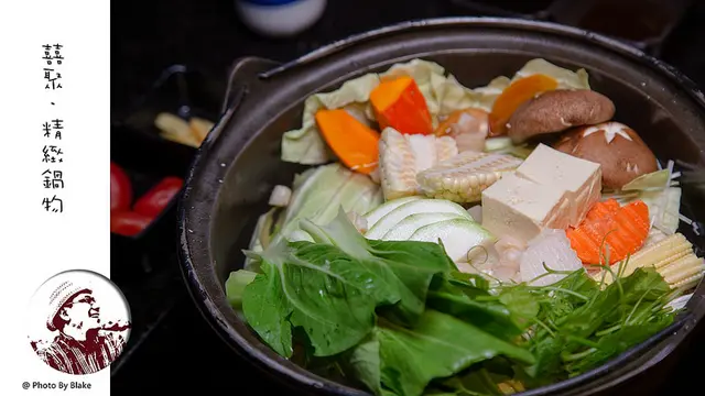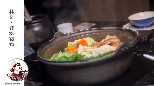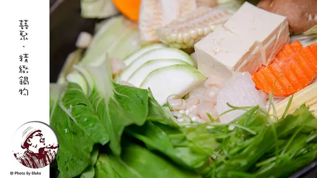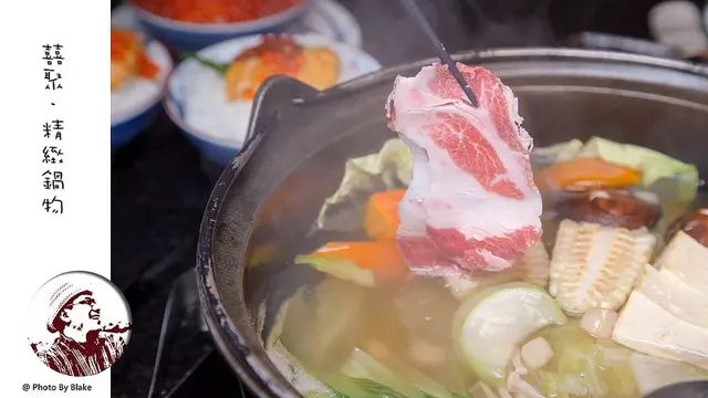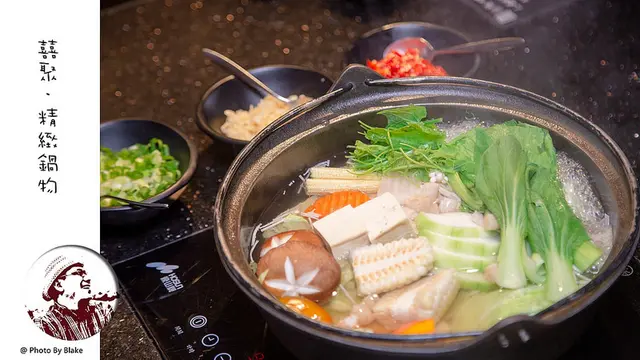 囍聚最有名就是火鍋湯頭,是用老母雞雞軟骨、雞架子與10多種時蔬去熬,還加上大量的日本小干貝,湯頭就是如此簡單,沒有其他調味,喝起來也很甘甜,同時提供手刨柴魚片,可以增加湯頭鮮甜度,火鍋料也是用較為天然的蔬食,水果玉米、高麗菜、豆腐與香菇。