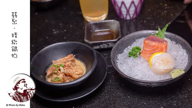 開胃菜有綜合生魚片與燉豬肉兩種選擇,綜合生魚片有鮭魚、旗魚與炙燒干貝。相較於綜合生魚片,我更推薦這燉豬肉,已經燉到非常入味豬肉,口感軟嫩咬起來沒啥阻礙,還帶有一眼QQ豬軟骨感,一同燉的蘿蔔很入味,讓人想配飯吃。