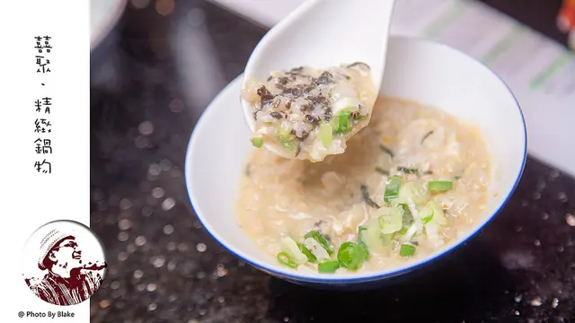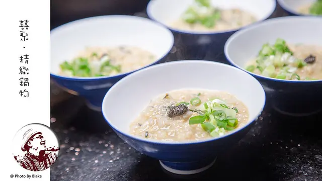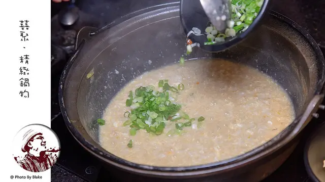 將白米飯倒入鍋內,接著避免燒鍋不斷地用湯匙攪拌,當鍋裡呈現稠狀時,將打勻的蛋液慢慢倒入,邊倒邊攪拌,最後加入海苔與蔥花,這時候還不算大功告成,將粥倒入碗裡畫龍點睛加上少許的黑松露,再灑點蔥花,整碗的雜炊看起來就很高檔,吃起來更是暖在心頭,螃蟹與海鮮的湯頭底完全被白米飯給吸收,又加上黑松露的提味,有鮮甜感又不會太過。