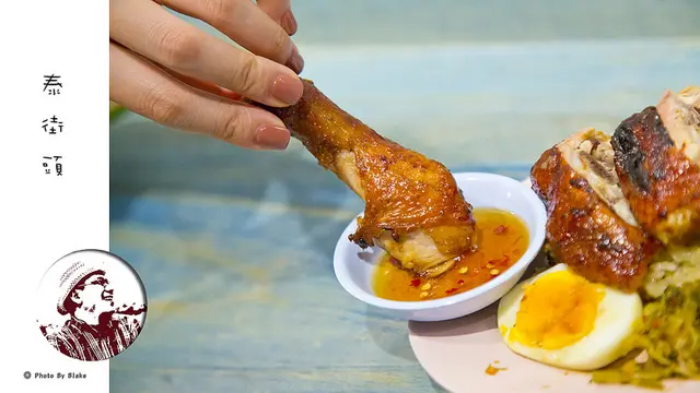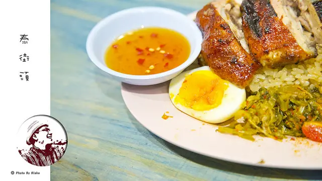 布雷克我點的是泰東北烤雞腿飯,一份主餐當然以烤雞腿為主,另外還有附上大黃瓜、芭樂、糖心蛋與酸菜等等配菜,還有個小碟子裝泰式酸辣醬。雞腿算是大支的,因此切成四塊方面進食,皮是有烤到部份地方焦焦的,咬下去還帶有一些肉汁,雞肉烤的算是不錯,骨肉分離,泰式酸辣醬辣中帶點甜,搭配雞腿也好好吃喔!