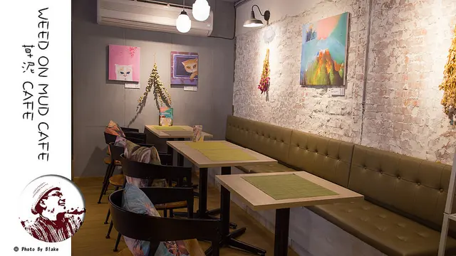 店內空間主要分成兩個區塊,一邊是以咖啡廳餐廳營業為主的草泥CAFE WEED ON MUD,而草泥CAFE 的用餐環境也分成兩間,兩邊走的風格也不一樣,水泥地遇上了木質地板,不一樣的傢俱讓兩邊有了不一樣餐廳的感受,開放區域像是輕工業風格,靠窗有個小吧區,店裡沒坐滿,在這可以使用插頭用上電腦一整天,戶外則是吸煙區