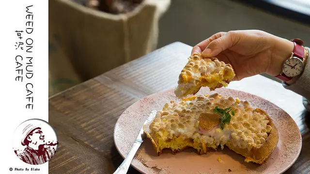 在草泥CAFE WEED ON MUD甜點主要是以鬆餅為主,鬆餅的製作不加上任何一滴水,用的是台東的初鹿鮮奶,口味上有甜的也有鹹的,布老大點的是焗烤棉花糖,光是鬆餅上面一球一球的棉花糖就超療癒的,在鬆餅與棉花糖之間還夾上雙色起司,當切開鬆餅的時候,也有像是披薩一樣的牽絲,起司接著會融化,口感上軟中帶有鬆軟,味道上有甜有鹹,滿特別的組合,實際就真的好吃。